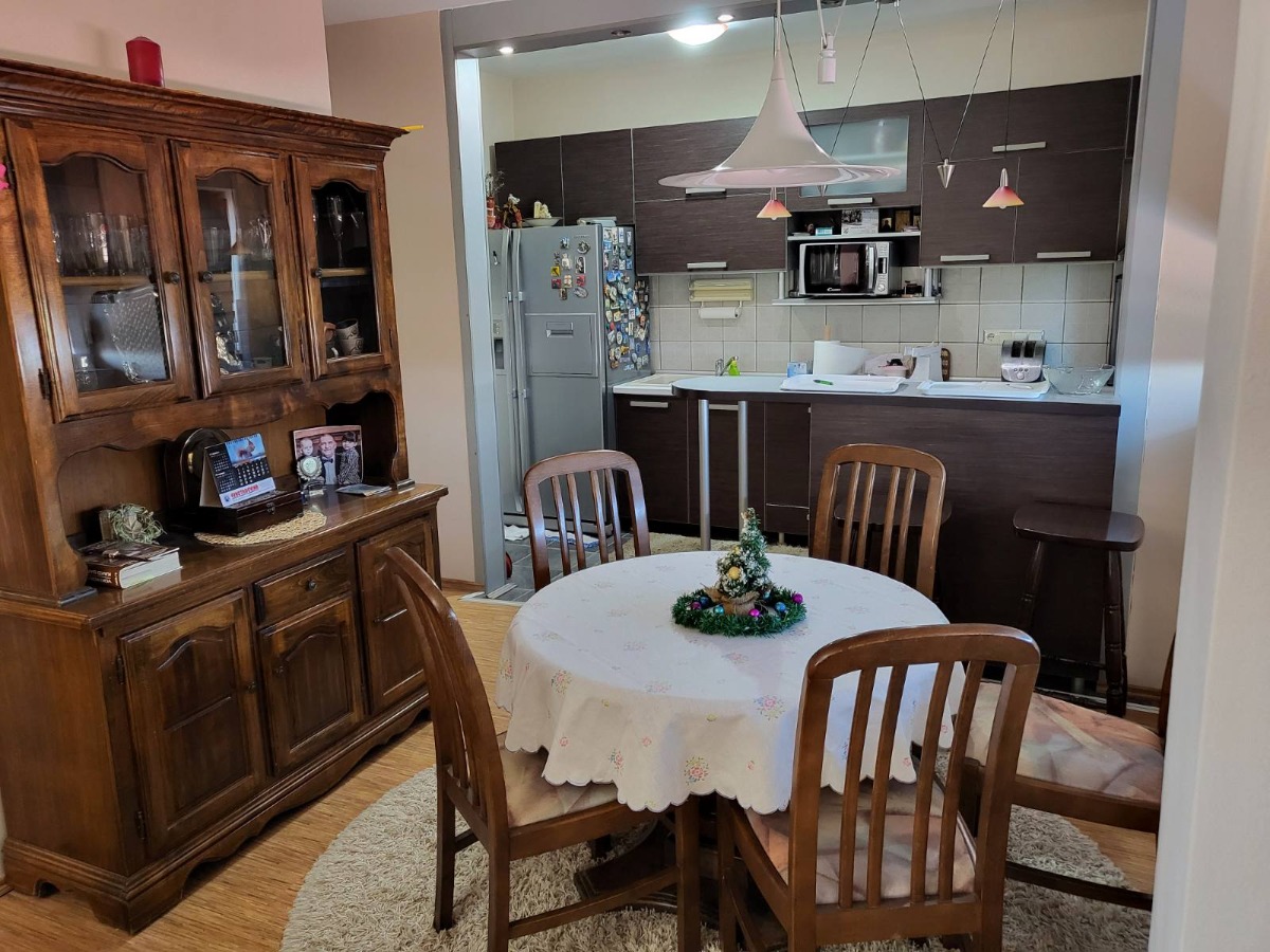 Sastoji se od 2 spavaće sobe, dnevnog boravka, trpezarije, kuhinje, kupatila, špajza, zatvorenog balkona i prostranog hodnika. Obezbeđen je sigurnosnim vratima i video nadzorom.